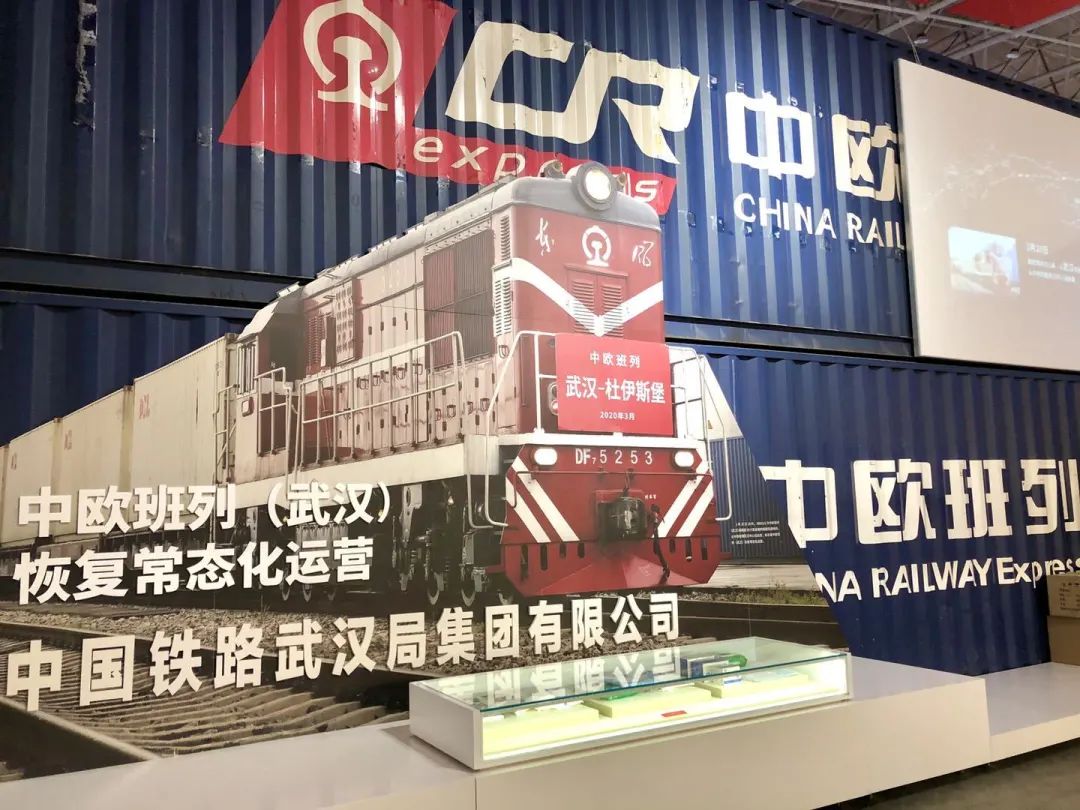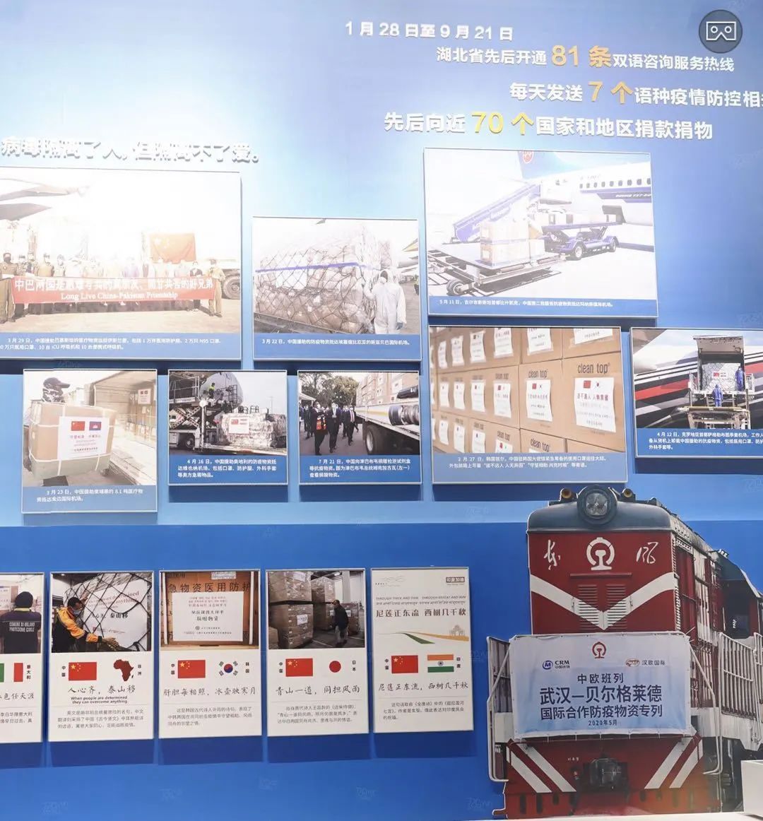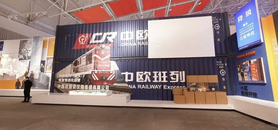 在展馆,1000余件(套)实物展品生动形象地诉说着战疫过程及经济重启的故事。在本次展览“疫后重振”板块里,展出了大批中欧班列(武汉)相关内容,包括中欧班列集装箱、班列重启发车现场照片、班列承载物资等。
