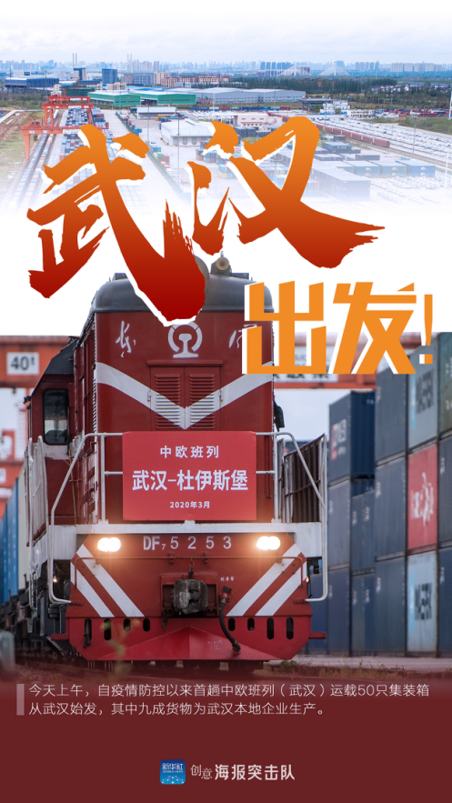2020年3月28日,中欧班列(武汉)再次出发,班列装载着汽车零配件、电子产品、通信、防疫物资等,合计50大柜。作为湖北省武汉市对接国家“一带一路”的重要项目,中欧班列(武汉)的开行从侧面上说明湖北省及武汉市统筹打好防疫和复产两场硬仗的信心,彰显了积极打造内陆开放高地、推动全面开放新格局的决心。