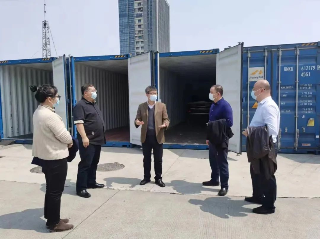 在检查去程班列陆港整车出口项目吉利车装箱安全的过程中,戴光文一行现场查看了吉利车装箱、绑扎、加固情况,详细了解了装箱方案、流程后,强调要加强整车装箱安全管理和装箱人员疫情防控措施,加强去程班列整车出口业务的组织协调,加强该项业务后续跟踪拓展,在确保装卸箱、运输安全的情况下,将去程班列陆港整车出口业务做大做强,为汉欧陆港创效增收。