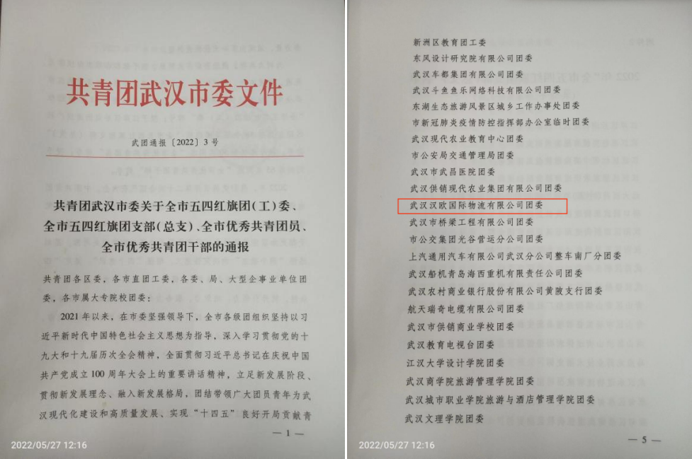 近日,共青团武汉市委印发了《共青团武汉市委关于全市五四红旗团(工)委、全市五四红旗团支部(总支)、全市优秀共青团员、全市优秀共青团干部的通报》,授予汉欧国际团委“全市五四红旗团委”称号。