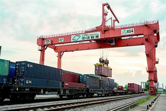 8月9日,中欧班列(武汉)X8015次列车正在中铁联集武汉中心站进行装车作业。这是今年武汉开出的第107次中欧班列,列车满载电脑配件、运动器材、机械设备等产品,由阿拉山口出境,经由哈萨克斯坦、俄罗斯、白俄罗斯、波兰等国,最终抵达德国。